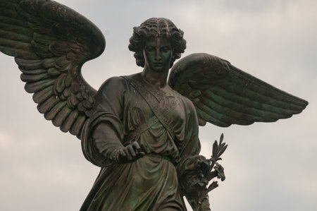 Ethereal Angel Figure with Cloudy Sky Backdrop