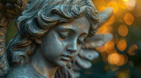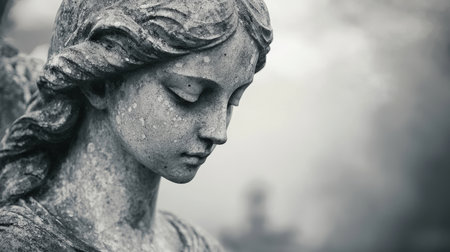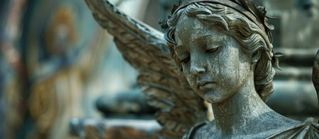 Close up of a sad stone angel statue in a cemetery. Copyspace, place for text. High quality photo