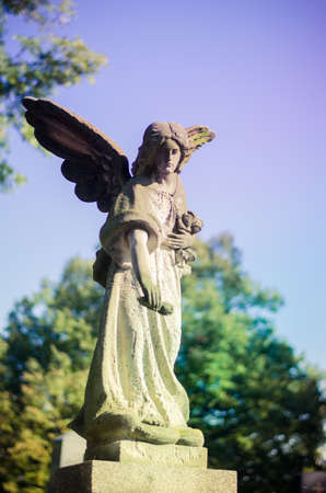 Old concrete statue of angel at Rasu cemetery in Vilnius Lithuania. Shot taken with a soft focus lens, shallow depth of field.