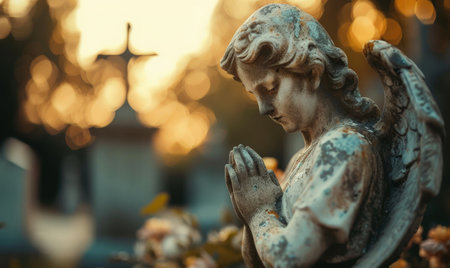 Angel statue in cemetery at sunset, vintage style, shallow depth of field