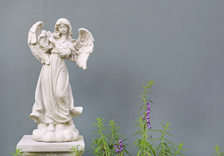 a small ceramic figure of a guardian angel clasping his hands in prayer. close-up, copyscape.