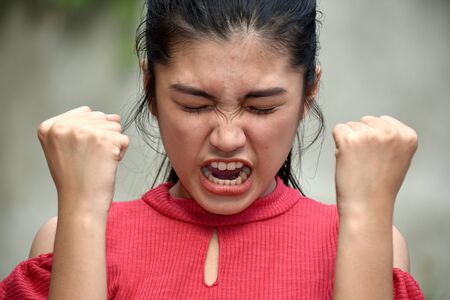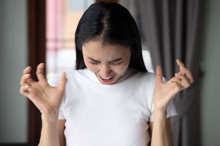 emotion face. furious angry woman in rage baring the teeth. young beautiful brunette girl portrait