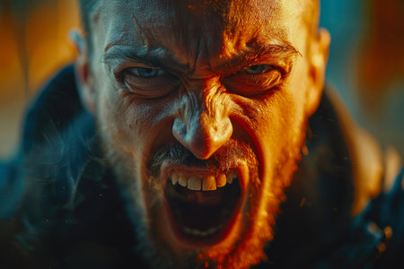 A man with a wild, unkempt hair and a red face is screaming. Concept of chaos and anger