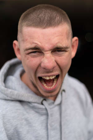 hate and desire to kill. man face distorted with anger. portrait of a young guy on light background. emotion facial expression. feelings and people reaction concept.