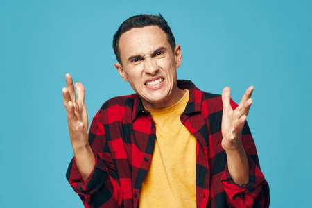 The guy on a blue background gestures with his hands aggression model stress Victory