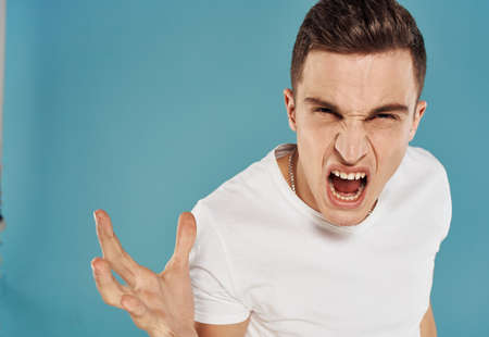 Angry man in white t-shirt gesture with hands displeasure blue background
