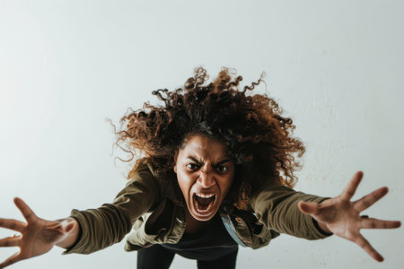 A woman with curly hair showcases a powerful display of emotion, expressing intense anger while reaching forward with her hands. The stark white background enhances her striking presence, emphasizing the raw intensity of her feelings.
