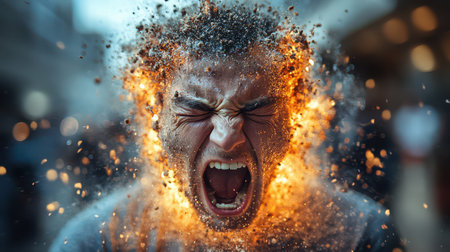 A man shows intense emotion while shouting as fiery sparks erupt around him. This moment captures raw passion and energy in a dynamic setting.