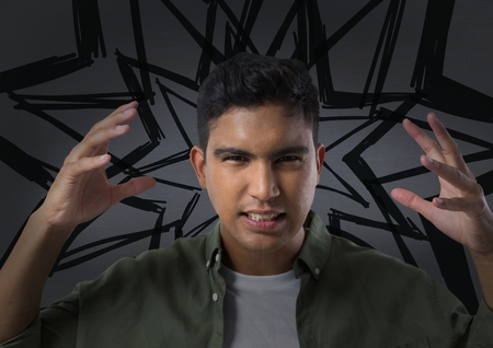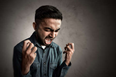 Portrait of young man screaming. Looking up in anger and making angry hand gestures.