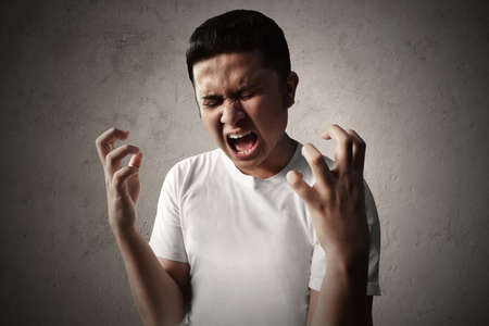 Young Asian man shouting loud because of anger. Close up head and shoulders