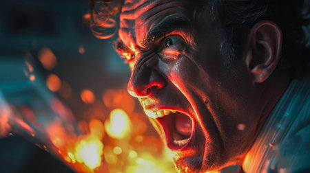 Close-up of an angry man shouting with intense expression in a chaotic office setting, capturing raw emotion and workplace stress.