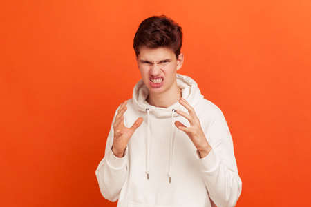 Extremely angry frustrated teenager in casual style sweatshirt with hood dissatisfied with service, scary grin on his face. Indoor studio shot isolated on orange background