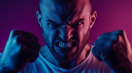 Angry man with clenched fists, teeth bared, and a furrowed brow, illuminated by intense blue and pink lighting, expressing raw emotion and aggression in a powerful portrait.