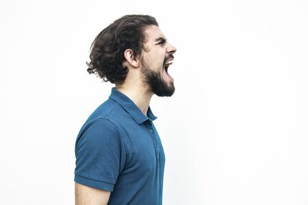 Side of excited guy shouting loud at copy space. Handsome bearded young man in blue casual t-shirt posing isolated over white background. Announcement concept
