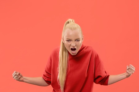 Screaming, hate, rage. Crying emotional angry woman screaming on coral studio background. Emotional, young face. Female half-length portrait. Human emotions, facial expression concept. Trendy colors