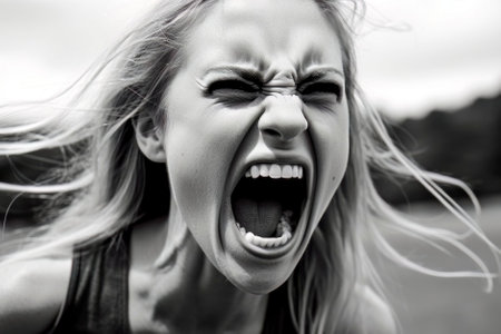 This powerful image captures an exhausted girl with closed eyes, a symbol of burnout, as she screams in anger
