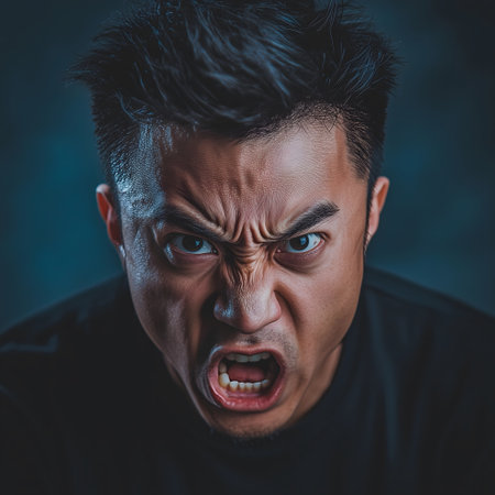 A man in a heated argument displays intense emotions, pointing aggressively. His facial expression shows rage and frustration during the confrontation.