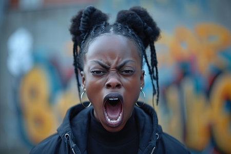 cropped portrait of a woman looking angry while sitting outside, created with generative ai