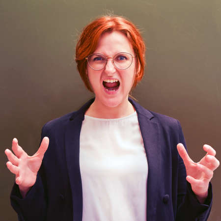 A female teacher with a face red with rage. Angry teacher yells at the background of school blackboard, Halloween