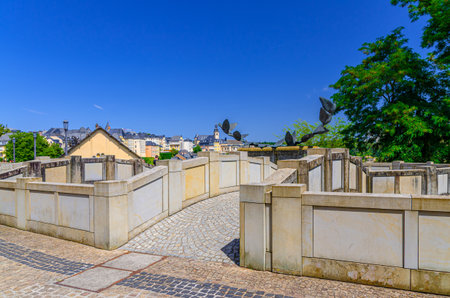 Fontaine aux colombes Fountain with dove of peace sculpture and small bridge in Judiciary Cite judiciaire Justice quarter in Ville Haute quarter with Luxembourg City historical center background