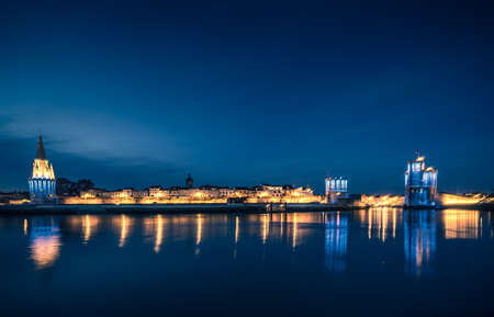 Panoramic view of the old harbor of La Rochelle at blue hour with its famous old towers