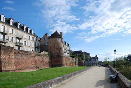 Embankment of Le Mans with ancient Roman boundary wall against the spring sky and modern dwelling s