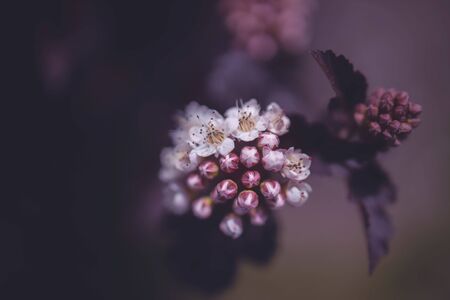beautiful bright creamy flower on a background of purple leaves of a bush in close-up
