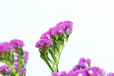 Detail of one focused violet flower of aphyllanthes monspeliensis centered in the picture on an unfocused background with more flowers