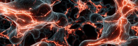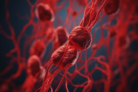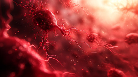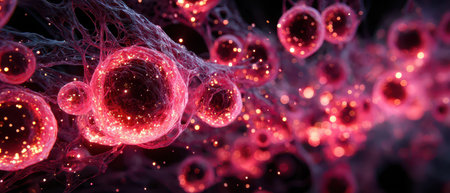 Glowing red cells connected by fine filaments create a mesmerizing view showcasing intricate biological structures in a dark environment.