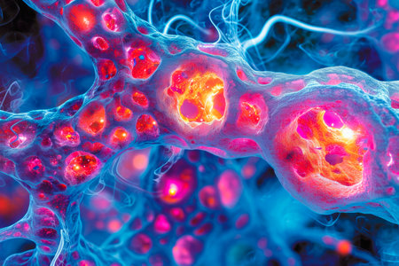 Discover a vibrant abstract microstructure showcasing cells and biological elements, illuminated with stunning colors and intricate patterns that evoke creativity.