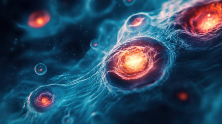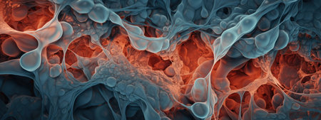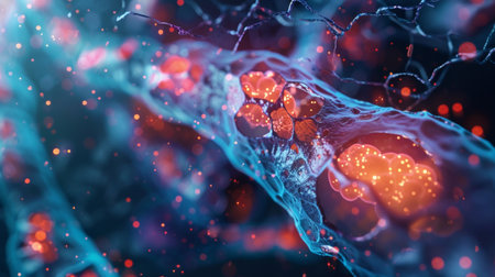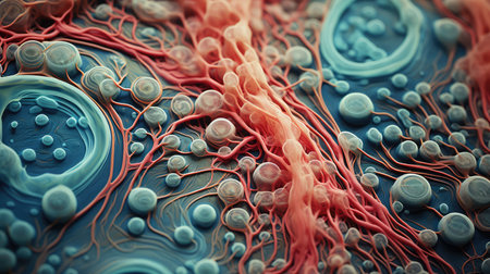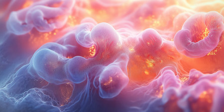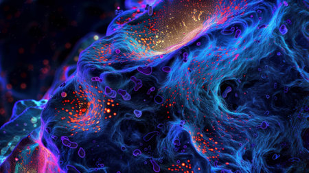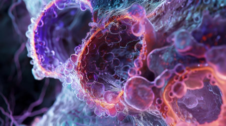 This vibrant abstract image explores cellular structures and bioengineering. The intricate patterns and colors illustrate molecular interactions and scientific advancements.