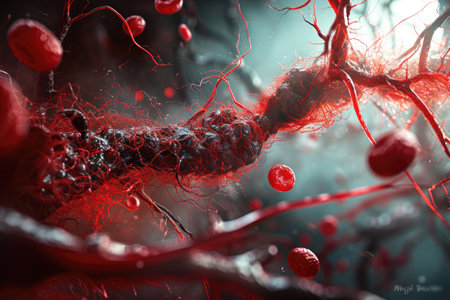 Detailed perspective of blood vessels filled with bright red cells on a twisted, dark background. The intricate network highlights the beauty of biological structures.