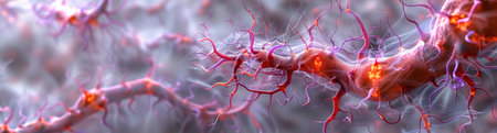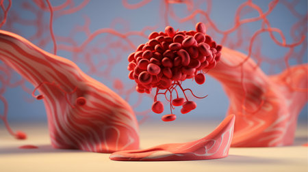 A colorful and dynamic image of angiogenesis in action with vibrant red blue and purple vessels forming and interconnecting
