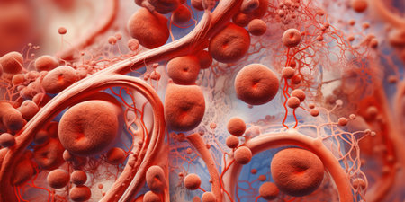 3D illustration mockup of the human organ systems, circulatory, digestive, red and white bloodcells wtih blurred backgroun. Medical education concept, Generative AI illustration
