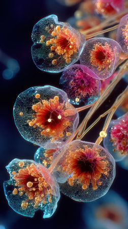 This stunning abstract image showcases a colorful representation of cellular structures with delicate tendrils and vivid spheres, perfect for science and art projects.