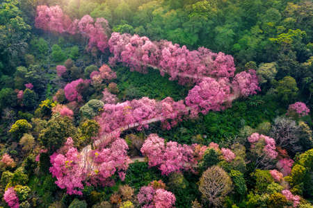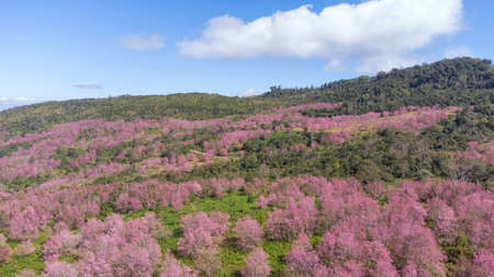 Aerial view Beautiful Wild Himalayan Cherry. pink blossom Sakura flower or Prunus Cerasoides full bloom in natural high area at phu lom lo, Loei, Thailand.
