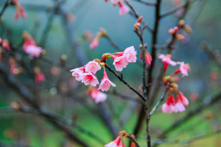 Pink flower blooming of Prunus cerasoides or Wild Himalayan Cherry in the forest