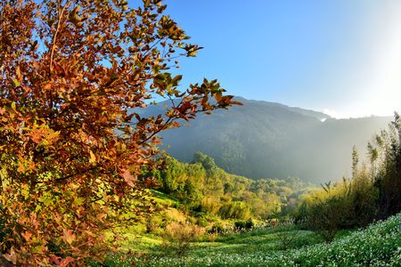 Mountains and clouds Plum tribe, Hsinchu, Taiwan-JANUARY 2, 2017: The sun shines on the mountain mist in the winter