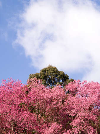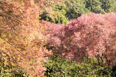 landscape of Beautiful Wild Himalayan Cherry Blooming pink Prunus cerasoides flowers at Phu Lom Lo Loei and Phitsanulok of Thailand