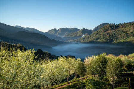 beautiful panorama scene of doi angkhang mountain with mist in morning