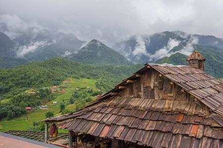 Lao Cai, north - west Vietnam - July 14, 2019 : Pomu wood roof of a house at Cat Cat village in Sapa.