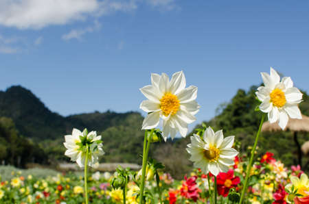 White dahlia flower in the garden and blue sky
