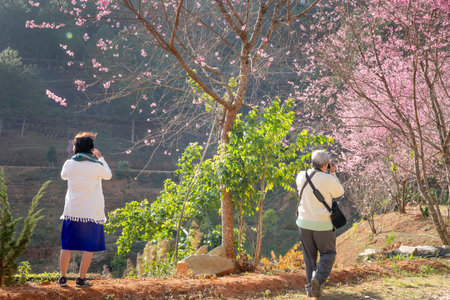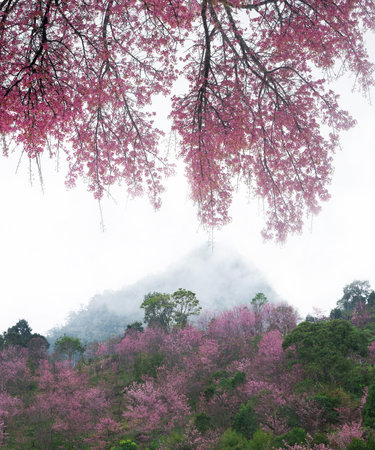 Landscape of Angkhang mountain with wild Himalayan Cherry flower or Prunus cerasoides flower of Sakura Thai blossoms at Fang District, Chiang Mai, Thailand