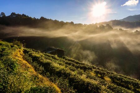 Beautiful Tea plant 2000 when the sunrise time with fog and sun flare at Doi angkhang, Chiangmai province, Thailand