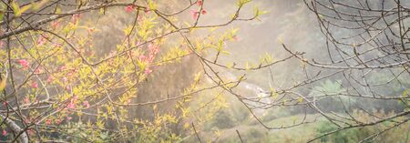 Panorama beautiful valley and mountain view with peach flower blossom in rural North Vietnam. This is ornament trees for Vietnamese Lunar New Year Tet in springtime.