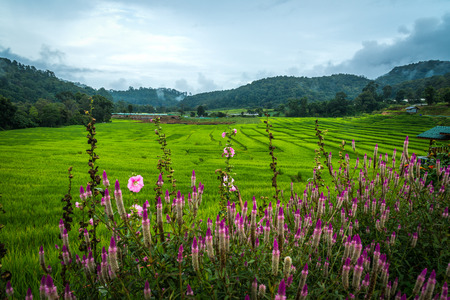 View of terraced rice field with a purple flowers foreground in cloudy day at Mae Klang Luang in Chiang Mai, Thailand
