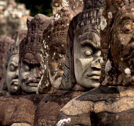 Impressive statues carved in rustic rocks in Ankgor Thom, Cambodia surrounded - World Heritage by UNESCO in 1992 - Colorful photo