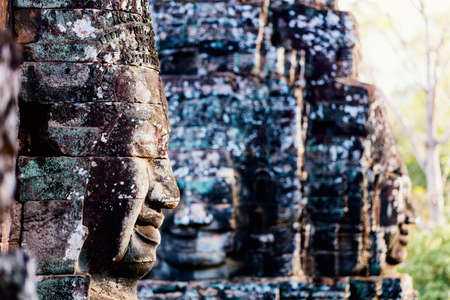 Stone faces in Bayon, Angkor Thom temple, selective focus sunset light. Buddhism meditation concept, world famous travel destination, Cambodia tourism.