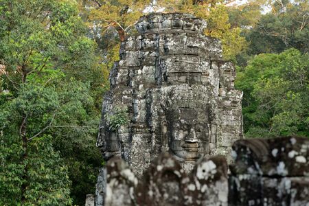 Giant stone face of ancient Bayon temple. Bayon temple nestled in Angkor Thom, Siem Reap, Cambodia. Angkor Thom is a popular tourist attraction.