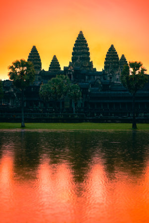 Beautiful sunrise at Angkor Wat temple with colorful sky and palm silhouettes in Siem Reap Cambodia
